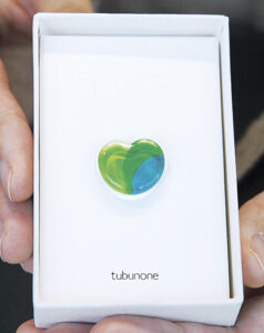 「信州ブランド」 輝くハート 理念共感 ピンバッジ制作 電子部品製造会社・木曽駒ミクロ ガラスで