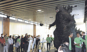 松本駅の「ゴジラ」お披露目 迫力ある手作り像に歓声