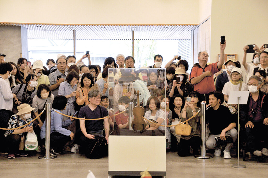 モーツァルト(1756~91)が弾いたバイオリンが22日、松本市大手3の市立博物館講堂に展示された。午後2~5時まで3時間限定で公開され、歴史的な名器を一目見ようと多くの来場者が押し寄せた。