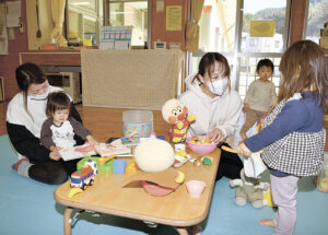 園で行われている山雅の巡回教室でサッカーが好きになったという勝家健翔ちゃん(5)は「(初めてで)楽しい」と笑顔を見せ、元選手との交流も喜んでいた。順調に育てば夏に枝豆として、秋に大豆として収穫し園児が味わう。