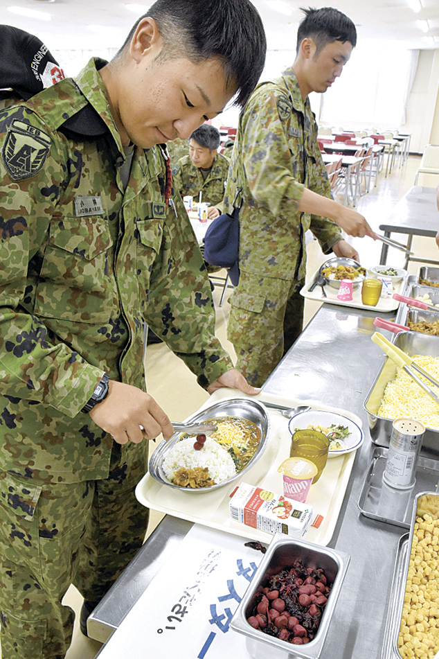 まず、野外活動が多い陸上自衛隊松本駐屯地(松本市高宮西)を訪ねた。お昼時に食堂に案内されると、隊員は大盛りのほうれん草チーズカレーに、「自家製」の梅をご飯の上に載せておいしそうに食べていた。第306施設隊で3等陸曹の小林優斗さん(27)は「梅は一日の活力を付けるため朝に必ず食べている。今年の梅もいい出来で、塩分補給になる」と話した。駐屯地の食事を取り仕切る糧食班長や、管理栄養士によると、1回の食事の量が多く、摂取する栄養は足りているため、食欲が落ちないように夏は冷たい麺類のメニューを増やし、デザートを少し多めにしているという。
