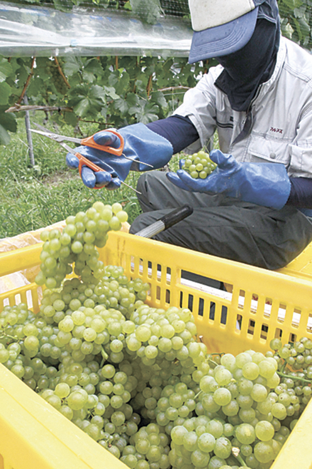 ベリービーズワイナリー(塩尻市宗賀)は9日にナイヤガラの収穫が終了。今後、赤ワイン用のコンコードの収穫に入る。11月初旬には最初の新酒が出来上がるという。同ワイナリーは「昨年は夏場の長雨に泣かされた。最後まで好天が続いてほしい」と願う。