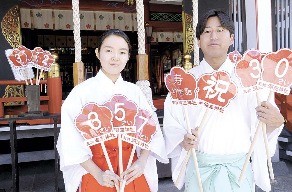 七五三シーズンが本格化するのを前に、松本市深志3の深志神社が、記念撮影用のミニプラカードを拡充・常設した。これまで「3さい」「5さい」「7さい」のカードを用意していたが、数字を組み合わせるなどして幅広い世代の利用があることから、0~9の全ての数字を網羅した。「祝」や「寿」などのカードも加え、さまざまな参拝客に利用してもらいたい考えだ。