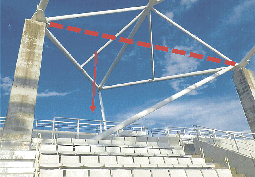 バックスタンド側には照明を支える架台が4基あり、そのうち一番南側で落下があった。2日午後4時ころに発見された。直径20センチほどの鋼管を接続する鋼板が破断し、鋼管が観客席に落下して7席が傷んだ。