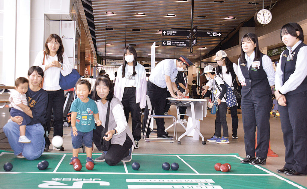 東西自由通路では、パラスポーツのボッチャで駅員と対戦するコーナーが人気を集めた。同市里山辺の小学校6年生・柿澤登吾君(11)は「楽しい」と満面の笑顔だった。
