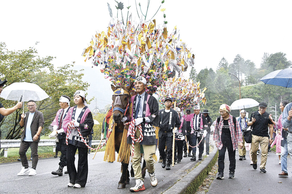 南木曽町田立で5日、300年以上続くとされる県無形民俗文化財・花馬祭りが開かれた。五穀豊穣や家内安全などに感謝を表す祭りで、「花飾り」を背負った木曽馬3頭や住民約70人でつくる行列が地域を華やかに練った。
