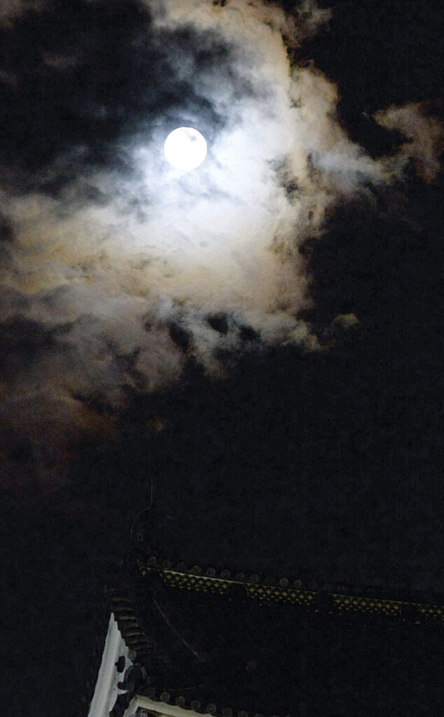 厚い雲に覆われ、隙間から見え隠れした月は7時過ぎに、丸い姿を表す時間が長くなった。訪れた人たちはひんやりした空気の中、カメラを向けたり、スマートフォンをかざしたりして写真に収めていた。