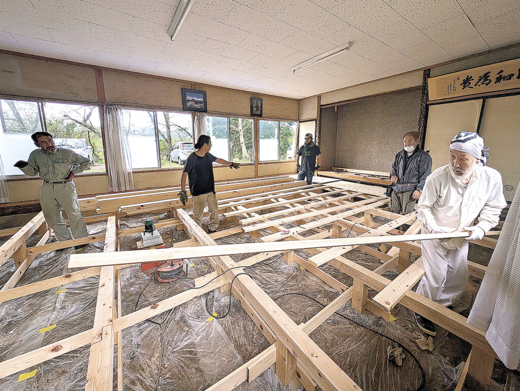木造平屋の建物のうち、広さ約30畳の広間の床下を全て取り外して木材を組み直し、畳を敷き直す。前区長の安坂清人さん(66)は「数年前から床がたわむようになり、だましだまし使ってきたがもう限界。村の資材提供はありがたい」と感謝する。