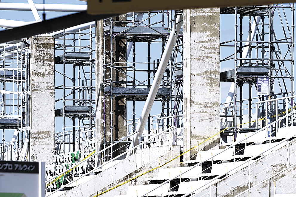 照明用架台には足場が組まれている。ただ「人繰りを含めて奔走している」(県松本建設事務所)状態で、点検に着手するめどは立っていない。13日の施設の無料開放イベントは中止となった。