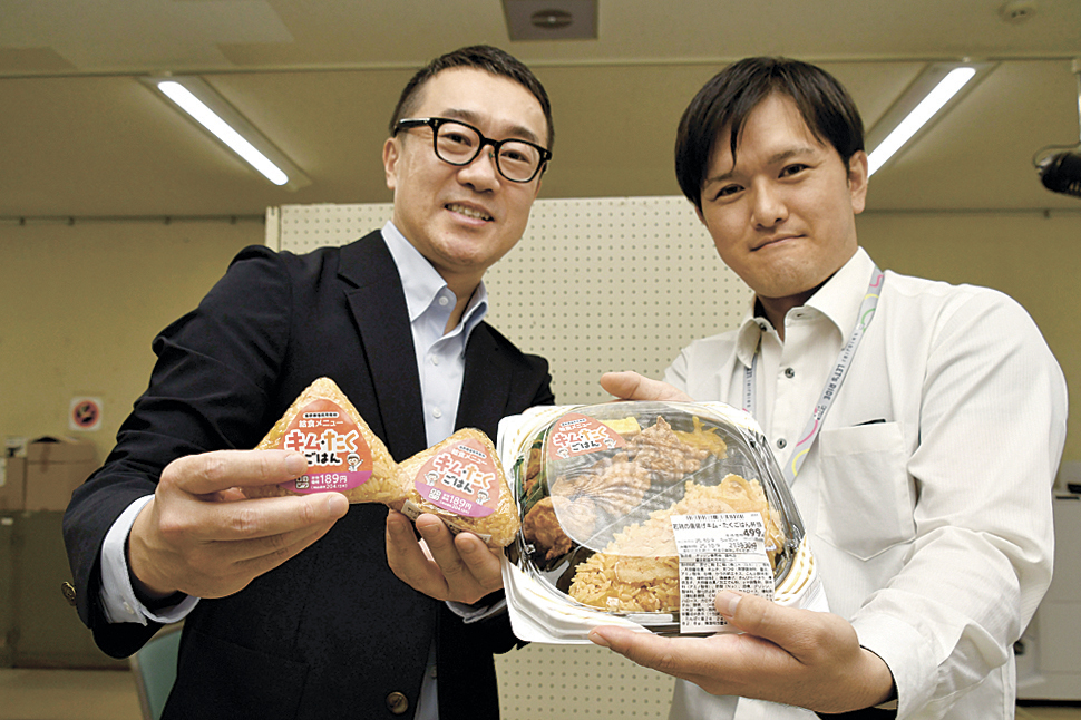 「キム・たくごはん」は豚バラ肉、大根のしょうゆ漬け、ごま油で炒めたキムチを使い、天つゆをだしにしたご飯を混ぜた。できる限りオリジナルレシピを再現しつつ、味はやや濃いめにした。包装には「長野県塩尻市発祥」の文字に、給食着姿の子供の絵柄が入る。おにぎりは1個204円、おかず付きの弁当は538円で関東や近畿の直営の470店で販売している。