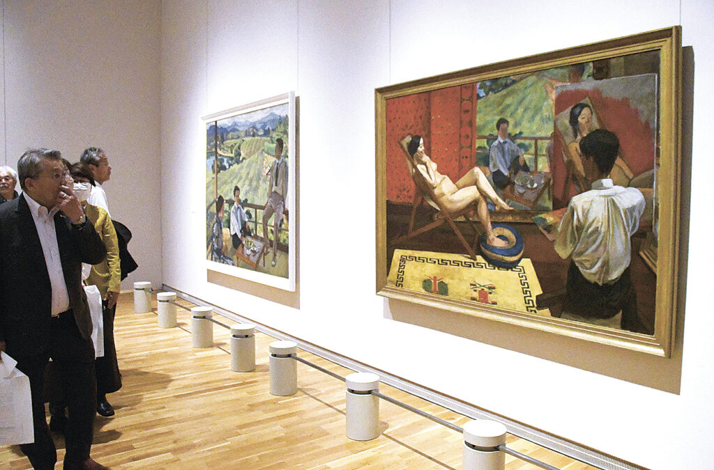 松本市美術館で11日に開幕する特別展「戦後80年 石井柏亭―えがくよろこび」の関係者向け内覧会が10日に行われた。中央画壇で活躍し、戦後は疎開をきっかけに移り住んだ松本を拠点に信州美術の発展に大きな足跡を残した石井柏亭(1882~1958)の大規模回顧展で、参加者は学芸員の説明に耳を傾けながら見て回った。