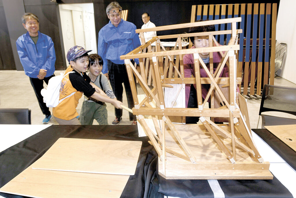 イベントでは防災用の保存食の試食や建築士による建物無料相談、耐震ワークショップが行われた。耐震構造の原理を学べる模型「ピノキオぶるる」を使ったWSでは、模型に組み込まれた耐震補強材の「すじかい」や「合板」の重要性を確認することができた。