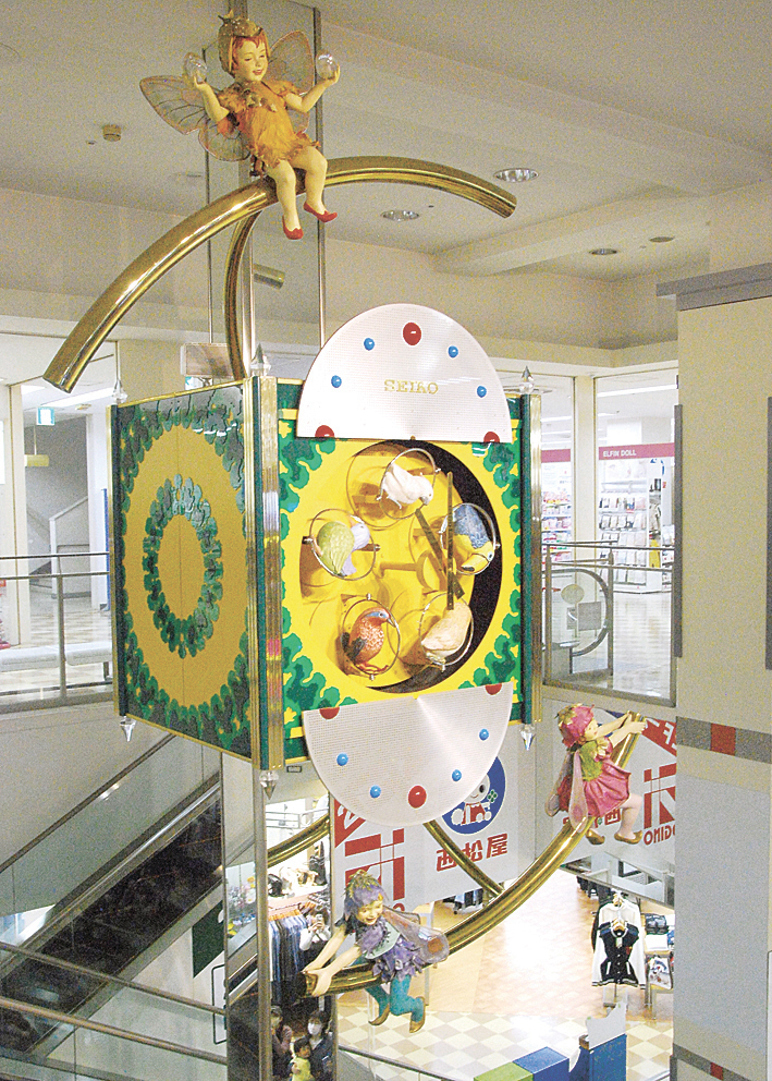 時計は幅2・1メートル、奥行き1・4メートル、高さ8・3メートルの箱形で、上下に付いた振り子に妖精の人形が座る。お披露目時刻の午前11時になると、メルヘンチックな音楽が流れて文字盤が上下に開き、中から5羽の小鳥がくるくると回りながら登場した。復活を待ちわびる大勢の来店客から歓声が上がり、山形村の女性(38)は「子供の頃よく見に来ていたので懐かしい」と語った。