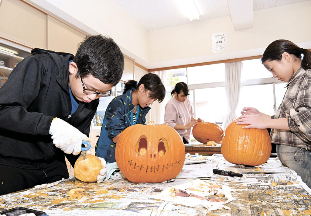 市観光課が用意した直径30センチ前後のカボチャにペンで顔を描き、実や種を取り出した。高さ50センチほどの縦長の大きなカボチャもあり、苦戦しながらも1時間かけて実を出した。目や口は小さなのこぎりでくりぬき、縫い合わされた口元を表現した少しこわい顔や、にこにこした顔などユニークな表情のカボチャランタンを次々に仕上げていった。完成させた後、互いに見せ合って楽しんだ。