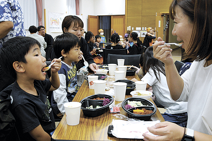 朝日村の有志団体や飲食店が手作りしたカレーライスなどを提供し、子供たちや住民の居場所づくりにつなげる「朝日村カレー大作戦―みんなの食堂プロジェクト」(村教育委員会主催、村社会福祉協議会主管)が17日、村中央公民館で開かれた。いつもは昼食だが、保育園や学校、仕事帰りの家族の交流の場にしようと夕方開催にし、会場飲食のみとした。約30家庭130人が訪れて、村商工会女性部特製の村産野菜たっぷりのキーマカレーをにぎやかに味わった。