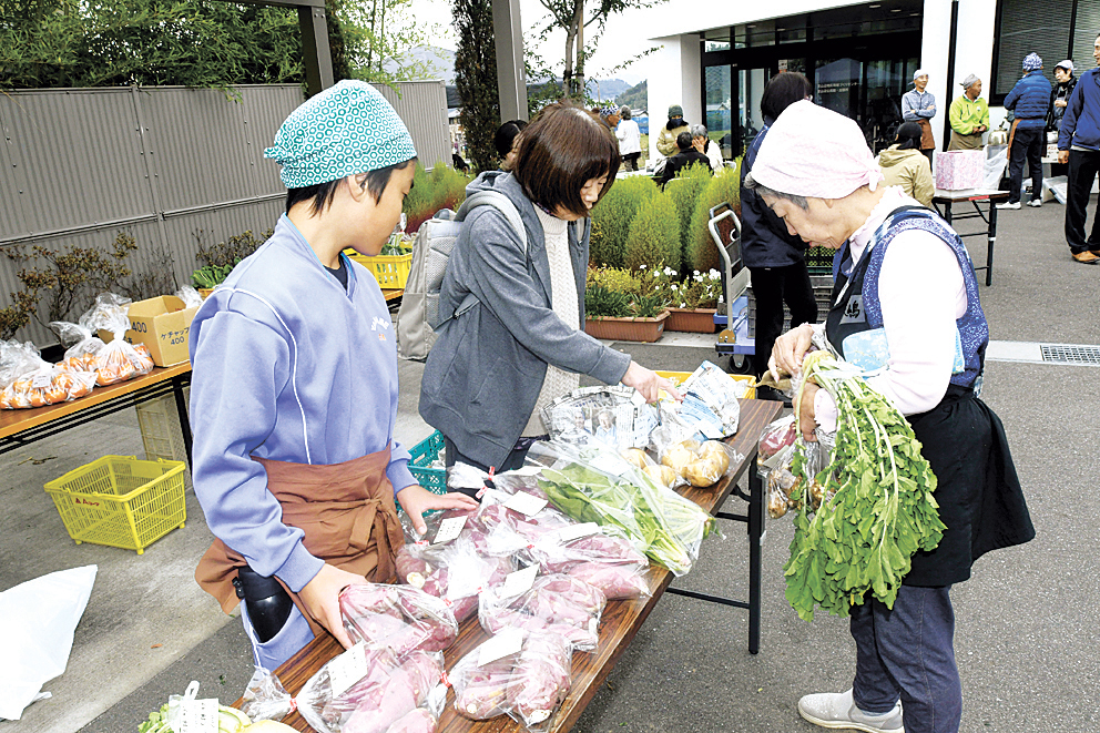 今回は初めて地元産の野菜を販売する「さとの市」も行われ、大勢の人でにぎわった。ジャガイモや葉野菜、柿などが格安で並び、カフェを訪れた人が次々と買い求めた。ナスを購入しお茶を飲みながら交流した笠松博美さん(84)は「朝からサロンを楽しみにしていた。野菜が安かったのでまた販売してほしい」と話していた。