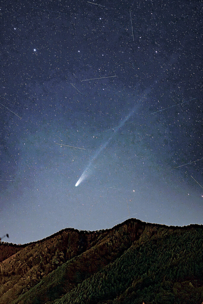 松本市安曇で温泉旅館を経営する筒木猛さん(51)が23日、地元の乗鞍高原で、レモン彗星の撮影に成功した。日の入り後、澄み切った満天の星空に、山の尾根ぎりぎりに延びるほうき星を見事に捉えた。