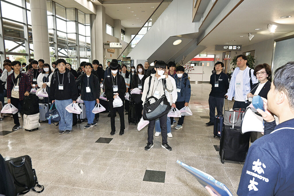 戦後80周年記念事業「松本と鹿児島をつなぐ特攻から考える平和学習」として募った小学生から20代までの若者42人とJC会員や保護者ら28人が参加した。空港での出発式で団長の伊佐治裕子副市長は、戦時中は松本空港の土地の一部が陸軍松本飛行場で、訓練を終えた特攻隊員が知覧に向けて飛び立った歴史に触れ「平和の尊さを考える旅にしたい」と呼び掛けた。
