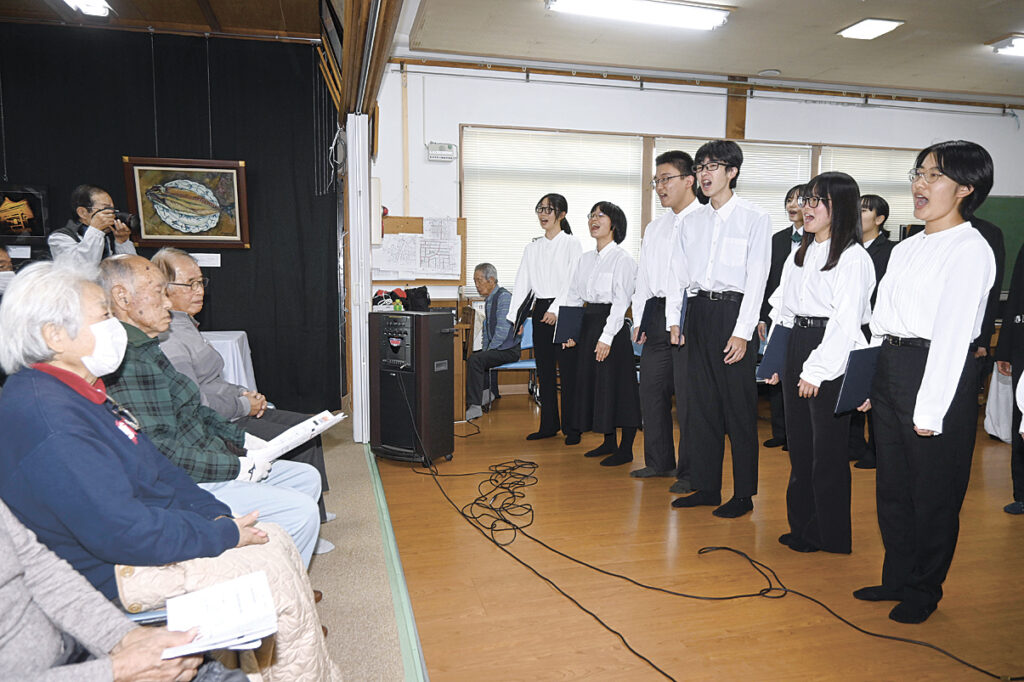 合唱班8人は、住民も一緒に歌えるようにと「手のひらを太陽に」などのなじみのある4曲を披露。口を大きく開けて元気に歌う生徒に住民は思わず笑顔になっていた。特撮ヒーロー研究会4人は「ストリカイザー」という独自のヒーローが登場するショーを勇ましく演じた。合唱班の2年生・大島優衣乃さん(17)は「アットホームな感じで楽しかった」と話し、住民の大神愛子さん(83)は「若い人たちはいいね。若返った気分」と笑顔だった。