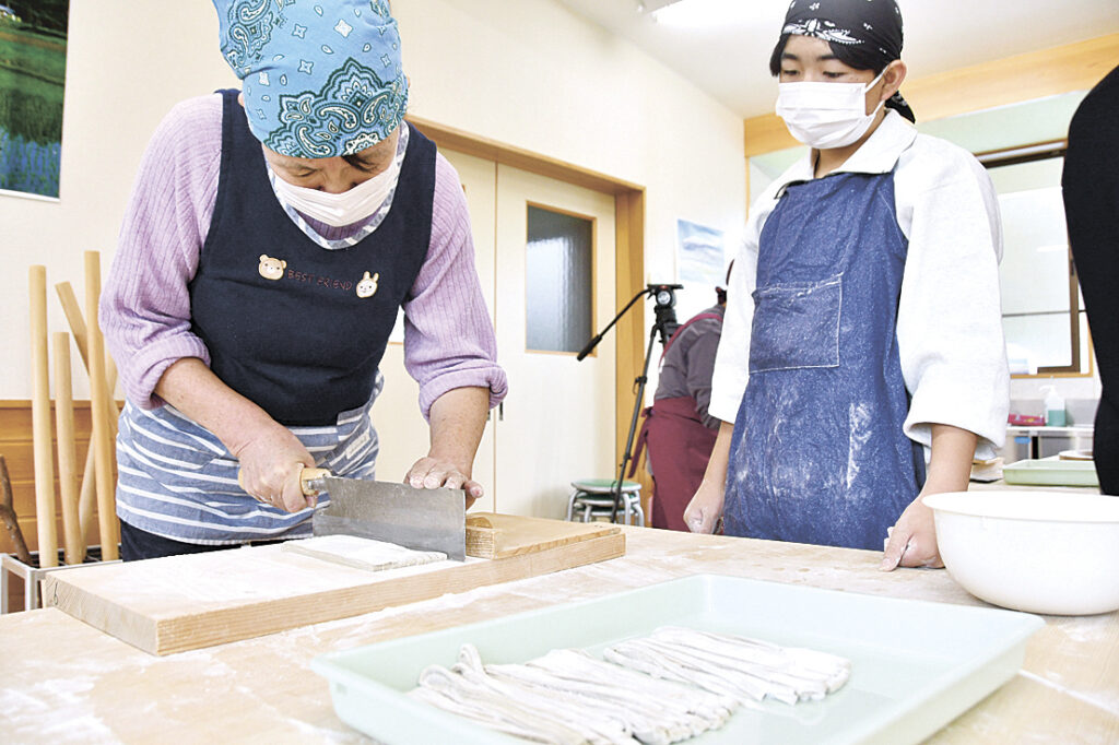 ソバの産地として知られる木曽町開田高原でかつて食べられていた「そばきしめん」について学び、実際にそばを打つ講座が25日、開田の木曽馬の里おみやげお食事センターで開かれた。通常より幅が広い麺をつゆで煮込んだもので、参加した住民らは体験を交え地域の食文化を学んだ。