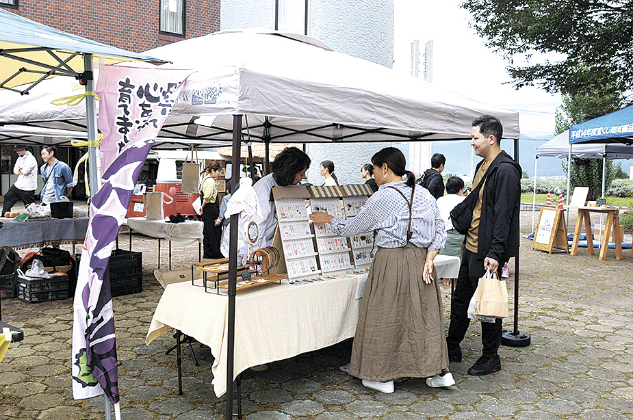 日用市は、村出身で下大池在住の小林聖也さん(36)が、地域の人が気軽に集まって交流や食事を楽しむ場を作ろうと、同級生4人を中心に実行委員会を設けて昨年11月3日に取り組み始めた。毎回、村内外の10店前後が出店し焼き菓子や、コーヒー、カレー、果物、アクセサリーなどを販売している。その都度、100人ほどが訪れておりリピーターも少なくない。