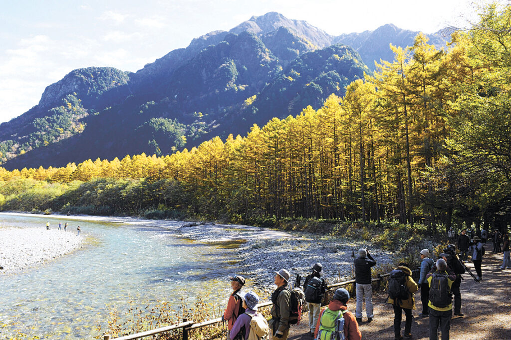 29日は晴れて、冠雪した穂高連峰の下、梓川河畔を散策する観光客の姿が見られた。陽光を受けて輝くカラマツの眺めを堪能し、写真に収める人もいた。