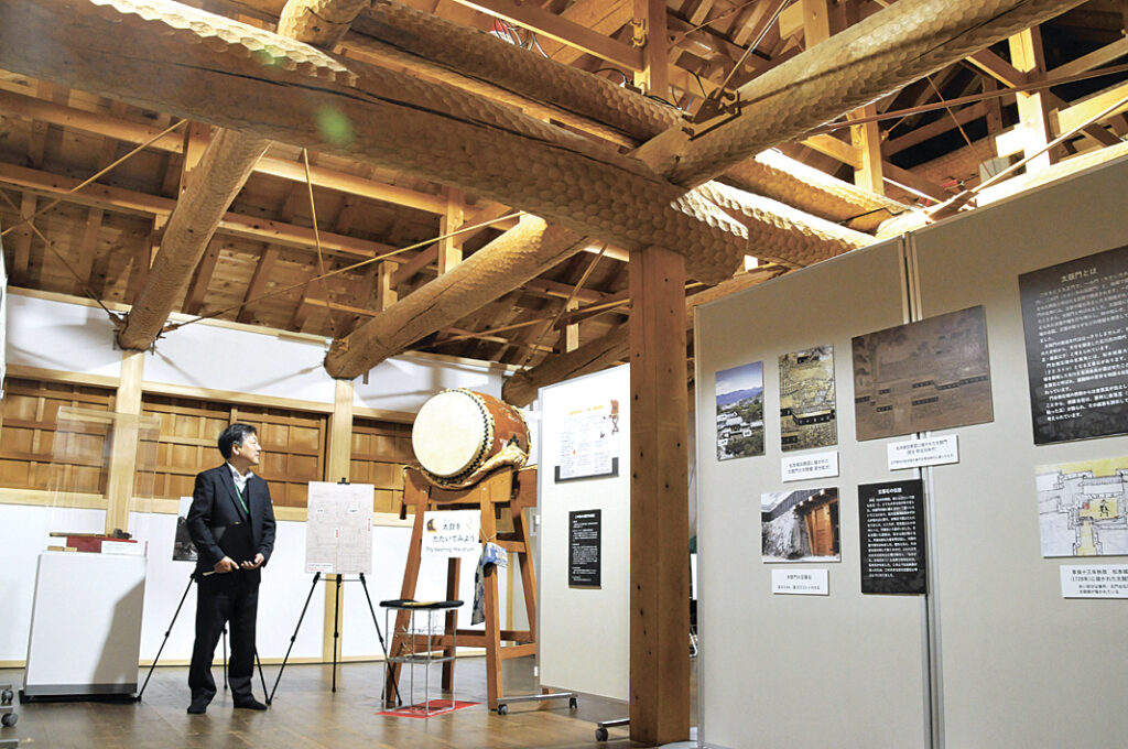 太鼓門を紹介するコーナーには実物の和太鼓が置かれ、木ばちでたたいて鳴らすこともできる。かつて太鼓は火災の知らせや正午の時報、藩士が一斉に登城する時の合図として使用されたという。