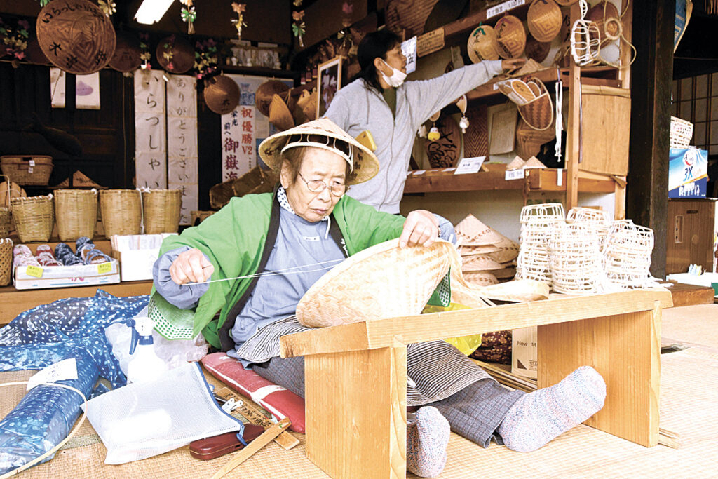 県指定伝統的工芸品の蘭桧笠は、ヒノキを薄く細長い短冊状に加工した「ひで」を立体的に編み込んで作る。約360年前に南木曽に技術が伝わったとされる。生産・販売拠点の桧笠の家で、作り手が随時手さばきを披露する。生産協同組合の池田興衛理事長(77)は「実際に見てもらうことで、手作りの良さ、職人の技を伝えられたら」と話す。