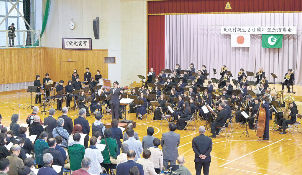 平成17(2005)年に旧3村(本城・坂北・坂井)が合併して誕生した筑北村の20周年を祝う功労者表彰と記念演奏会が1日、聖南中学校体育館で開かれた。地方自治や教育文化など村の発展に寄与した18人を表彰し、太田守彦村長が功労者にそれぞれ表彰状を手渡した。記念演奏では聖南中吹奏楽部と長野市民吹奏楽団(倉崎昌浩団長、長野市)の約70人が協演し、大勢の村民を美しい音色で楽しませた。