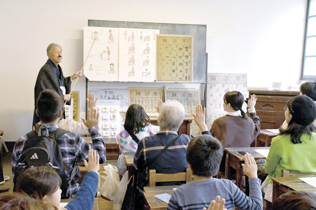 訓導役が一つずつ読み方を聞くと、観光客は早速、明治時代の挙手をまねし、楽しそうに受講していた。当時の小学1年生が習った範囲の単語で、絵を見て言葉を難解な漢字も含めて覚えていたことが伝えられた。