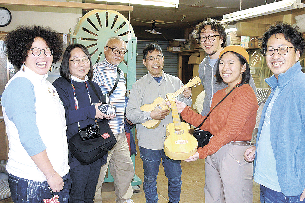筑北村に工房を構える「横山ギターズ」が、東日本大震災の被災地・福島県広野町を支援しようと、現地の材を使ったウクレレ制作に取り組んでいる。製品を提供するだけでなく、コミュニティーの活性化や地域経済の振興にもつなげたいと、1年前から現地に通って地元の人と交流してきた。試作品が完成し、先月29日に広野町の3人が初めて工房を訪れた。
