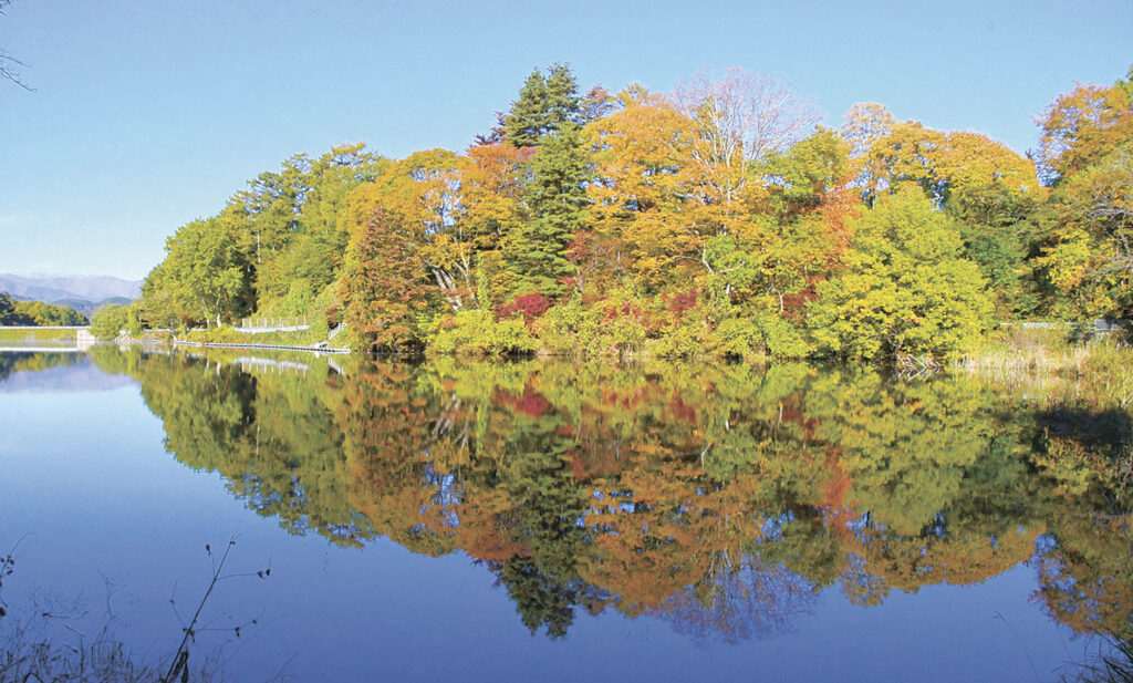 塩尻市郊外のみどり湖で、湖畔の木々の紅葉が進んでいる。市が広丘高出で行っている観測で最低気温が0・3度まで下がった4日朝は雲一つない青空の下、鏡のように澄み切った湖面に映った紅葉も楽しめた。