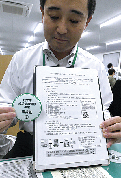 松本市が今年6月にスタートさせた「終活情報登録事業」の登録件数が5件にとどまっている。同事業は、市民が亡くなったり事故や病気などで意思を示せなくなったりした時に、事前に市に登録した情報を本人が指定した人や関係機関に開示する仕組み。登録に関する相談は一定数あるが、登録件数は6月に2件、8月に3件だった。市は「高齢者に限らず誰でも登録できるので、将来に備えてぜひ検討を」と呼び掛けている。