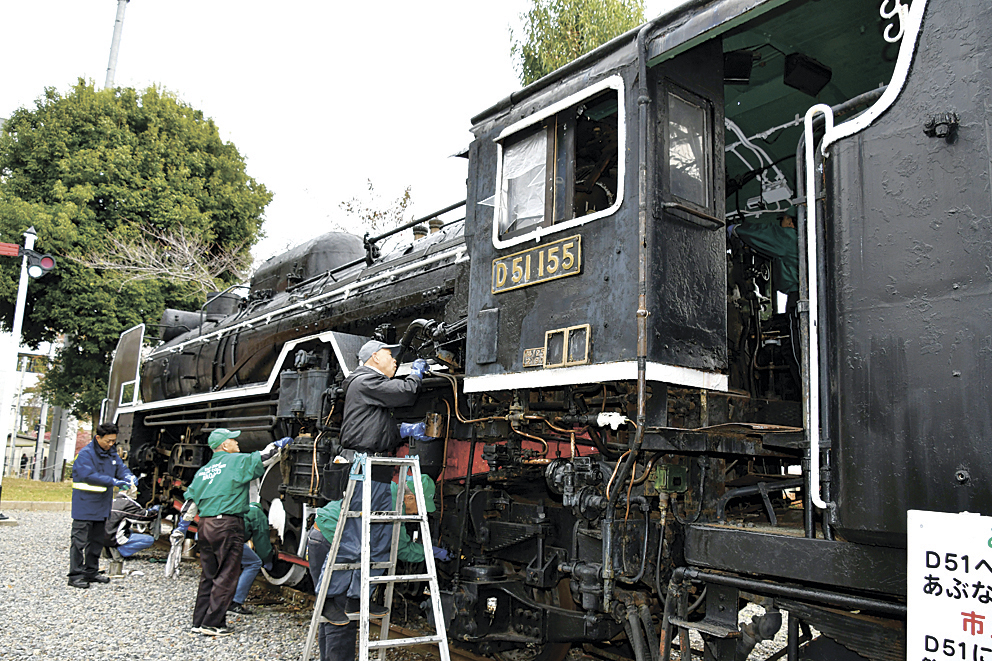 塩尻市役所の敷地に展示されている蒸気機関車(SL)の「D51」の清掃保存活動が5日、行われた。市内の旧国鉄OBを中心に構成する「D51(デゴイチ)会」が担う。ただ会員の高齢化が進んでいて、次世代に継承するため、今後も安定的に活動を継続する基盤を作りたいと、JR出身者でなくても一緒に活動する市民有志を募っている。