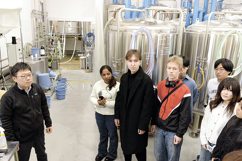 学生10人が6日、松本ブルワリーの醸造所(同市野溝西2)を訪れた。福澤崇浩常務(44)の案内で原料の麦芽やホップ、醸造用タンクを見学。ビール造りの現場と作業の流れを確かめた。経法学部2年生の浅野井瑞さんは「イメージした現場と違って驚いた。クラフトビールと一般的なビールを飲み比べたい」と話した。