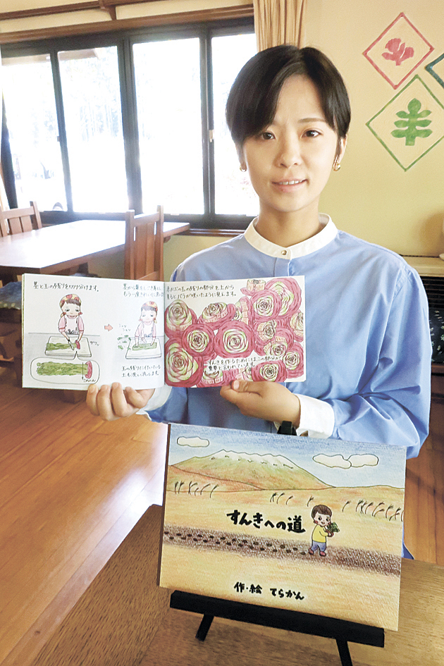 両親は開田高原西野のペンション「上天気」を営んでおり、母・京子さん(62)は毎年すんきを作り、利用客に提供している。その作業を手伝う中で絵本制作の構想を温めてきた。寺本さんは「すんきを知らない人をはじめ、地元の人や自分で作っている人にも読んでもらえたら」と話す。