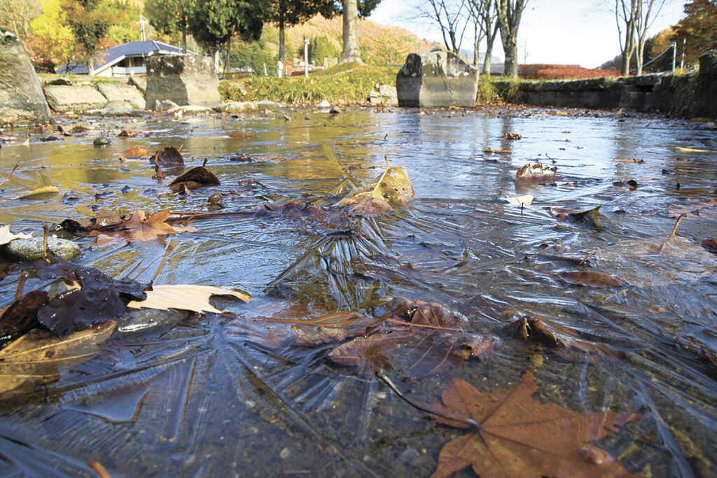 晴れて地表の熱が奪われる放射冷却などの影響で、塩尻市が広丘高出で行っている観測で最低気温が0度まで下がった12日、市内では水がたまった場所に薄い氷が張った。奈良井宿にある「水辺のふるさとふれあい公園」のせせらぎでは、氷が落ち葉を閉じ込め、冬の到来が近いことを感じさせた。