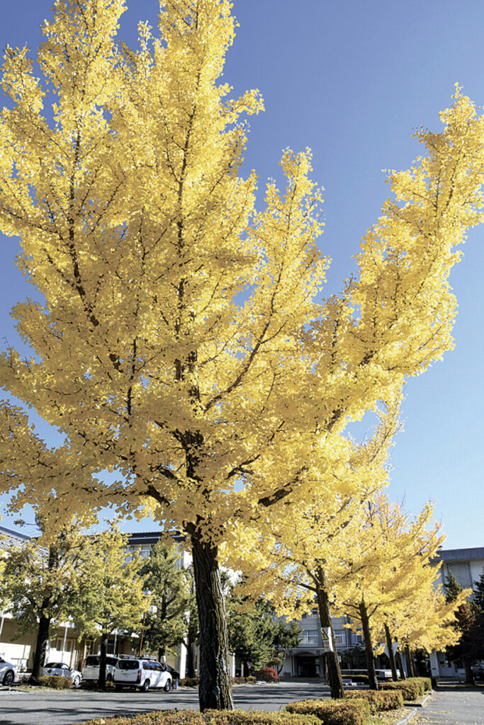 塩尻市の田川高校で、敷地西端の校門から延びるイチョウ並木が色づいている。昇降口に向かって東西に延びる通路を挟み、南北に並ぶ木々のうち、南側の葉が鮮やかな黄色になった。