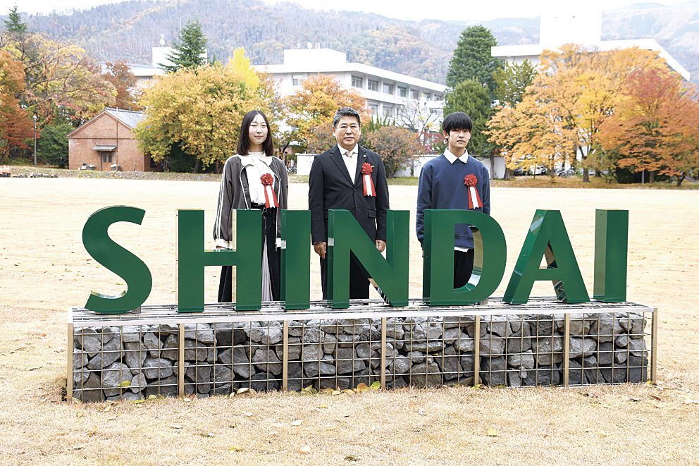 中村宗一郎学長はあいさつで、広場は環境と学問の自由のシンボルだとし「自由な発想で学問とは何か、人生とは何か考える場になれば」と願った。有志でつくる環境学生委員会で中央広場の活用を検討する分科会「しばふく」の学生らとともに「SHINDAI」のアルファベットをあしらったモニュメントを除幕し、シンボルツリーとなるカツラの木を植樹した。信大付属松本中学校の生徒も参加した。