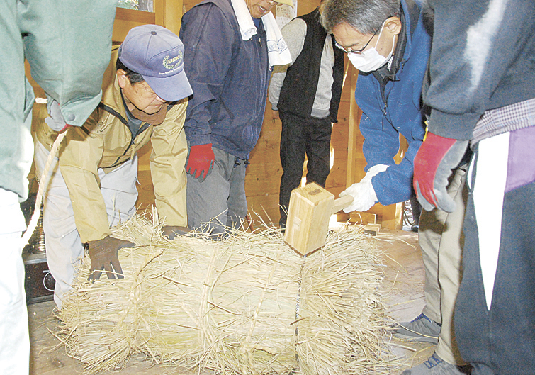 安曇野市豊科の新田、成相両区で、来年1月に行われる伝統行事のあめ市と福俵曳きに向けた準備が本格化している。街中を曳き回す福俵の製作が15日行われ、地元住民が盛大に開催できることを願いながら作業にいそしんだ。