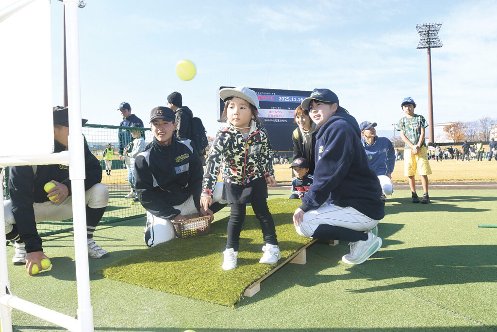 小学生と園児が対象で、ボールを的に当てる「ストラックアウト」や、バットでボールを打ちグラウンドを1周するベースランニングなど、さまざまな種目が行われた。松本市と塩尻市の高校の野球部員と、松本大学(松本市新村)の学生のエスコートで、子供たちは笑顔でイベントを満喫した。