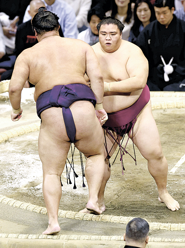 大相撲九州場所(福岡国際センター)中日の16日、上松町出身の西前頭13枚目・御嶽海(出羽海部屋)は西前頭15枚目・湘南乃海(高田川部屋)を押し出しで破った。低く頭から飛び込んだ御嶽海が押し切り、4勝4敗で再び星を五分に戻した。