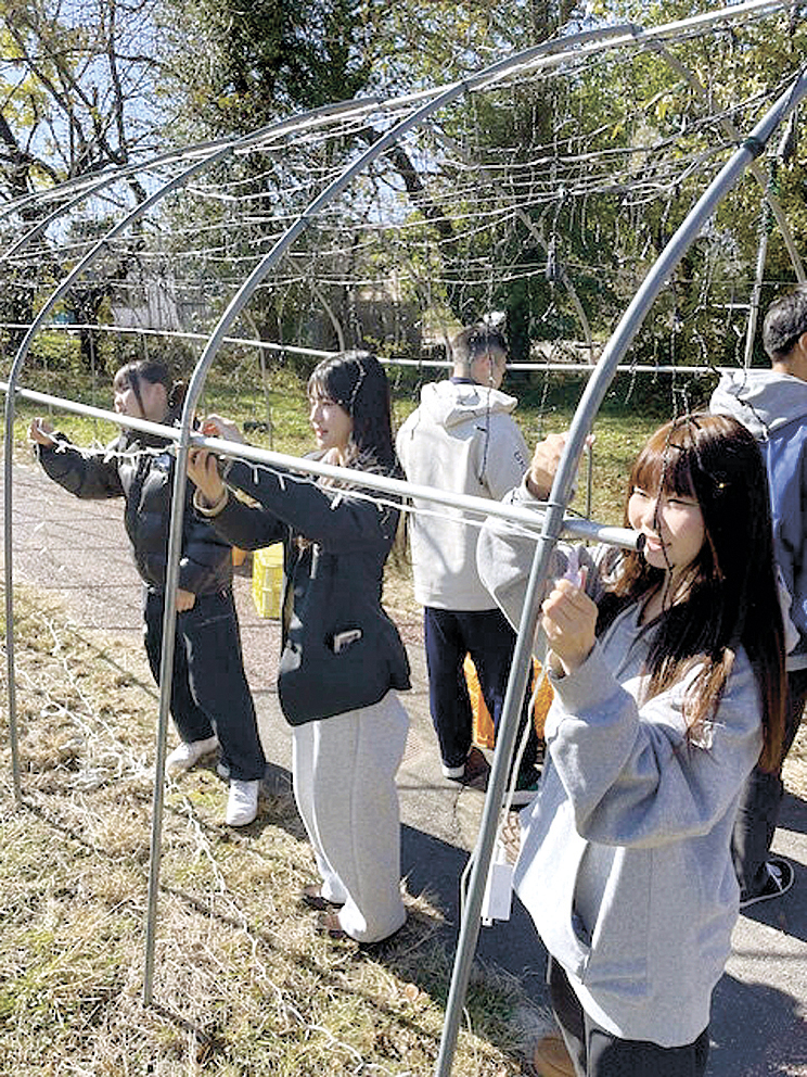 穂高商業高は冬場や若者の観光誘客をテーマに、地域・ビジネス探究コースの生徒が協力している。17日に約20人が安曇野の里を訪れ、農業用ビニールハウスの骨組みを使ったトンネルやワイヤメッシュに力を合わせて電飾を飾り付けた。