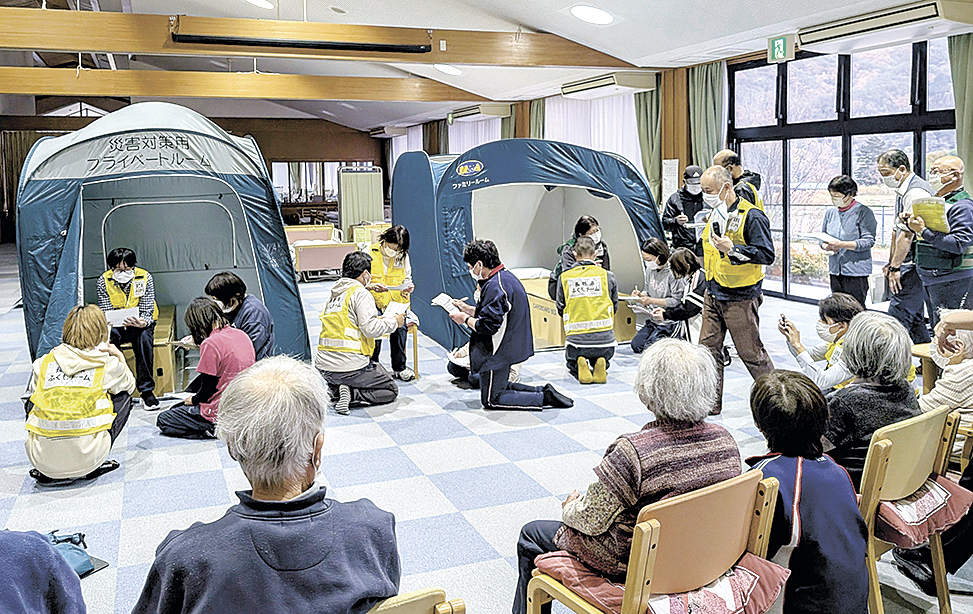 避難所の開設訓練では段ボールベッドとプライベートスペースを確保するテント形の囲いを組み立てた。デイサービスセンターを利用する高齢者も訓練の様子を間近に眺め、実際に寝転がるなどして使い心地を確かめていた。下伊那郡喬木村から参加した社協職員の鈴木鉄斎さんは「利用者の反応も知ることができた」と話していた。