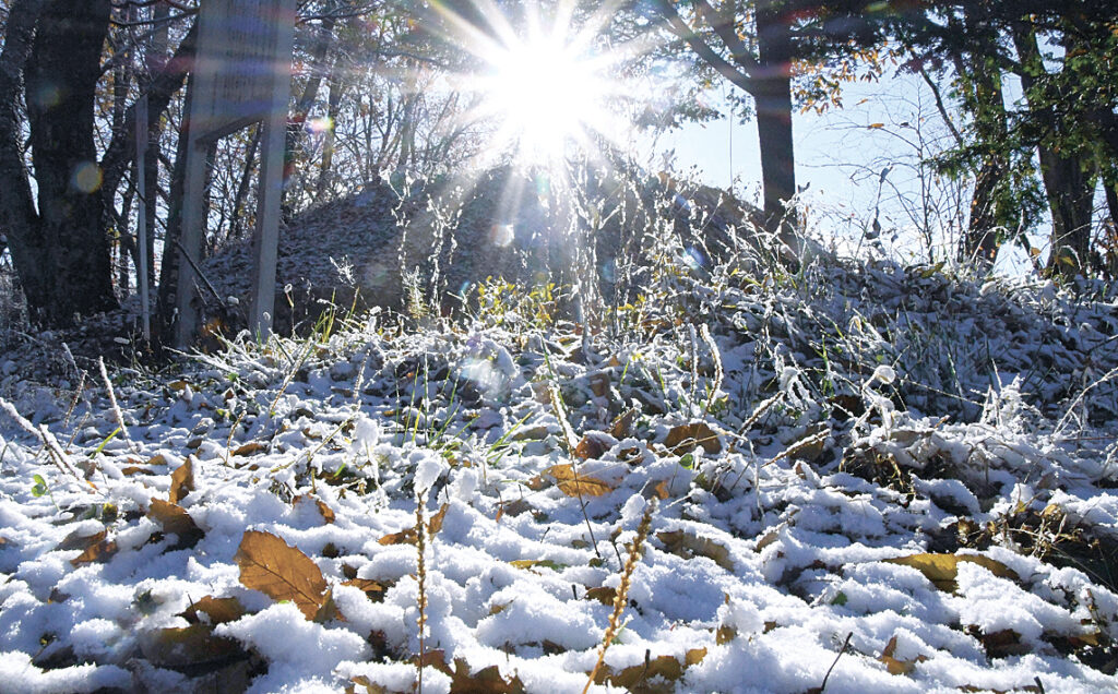 最低気温が松本市今井で氷点下0・8度、同市沢村が1・5度を記録するなど朝の冷え込みが強まり、夜半の雨が雪に変わった。塩尻市の旧中山道・東山一里塚周辺では、紅葉した木々や落ち葉が雪で薄化粧され、風情ある景色が広がっていた。