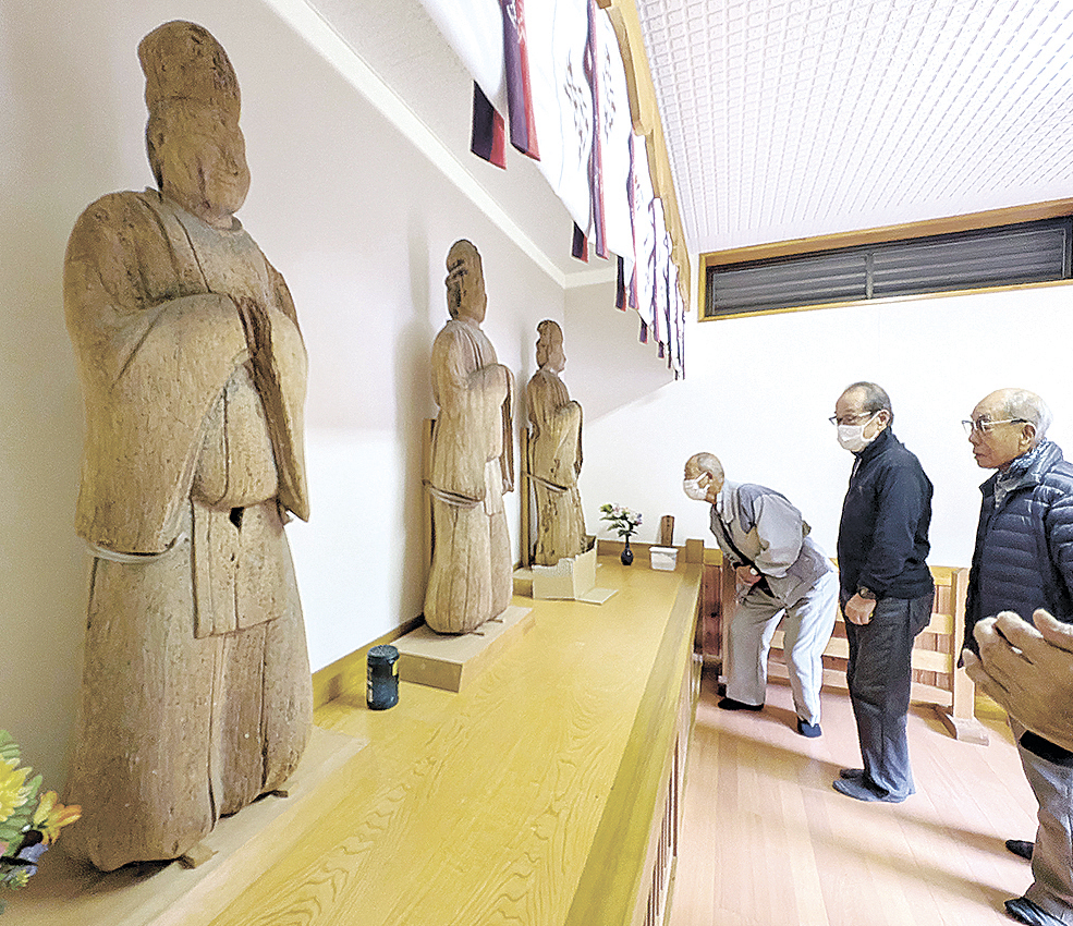 岩殿寺と仁熊大日堂、考古資料館を回った。うち岩殿寺では神田林明総代長の案内で、かつて岩殿山にまつられていた鎌倉時代作とされる三所権現神像(県宝)などを見た。貴重な木像だが虫食いの損傷も激しく、保存に課題があることを把握した。