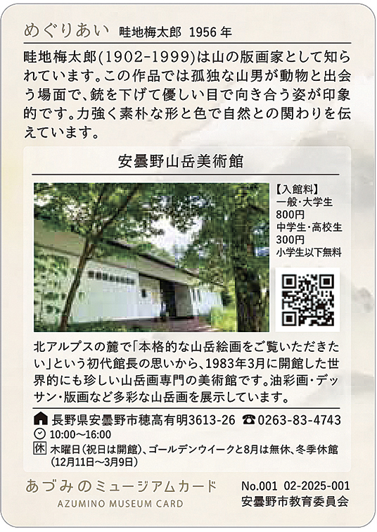 安曇野市は20日、市内の文化施設と施設のお薦め作品などを紹介するコレクションカード「あづみのミュージアムカード」の第2弾を12月9日に発行すると発表した。令和4年3月の第1弾発行から3年半ぶりになる。美術館や博物館の利用を促す取り組みで、対象施設を利用してカードを希望すると、利用施設のカードが無料で1人1枚もらえる。