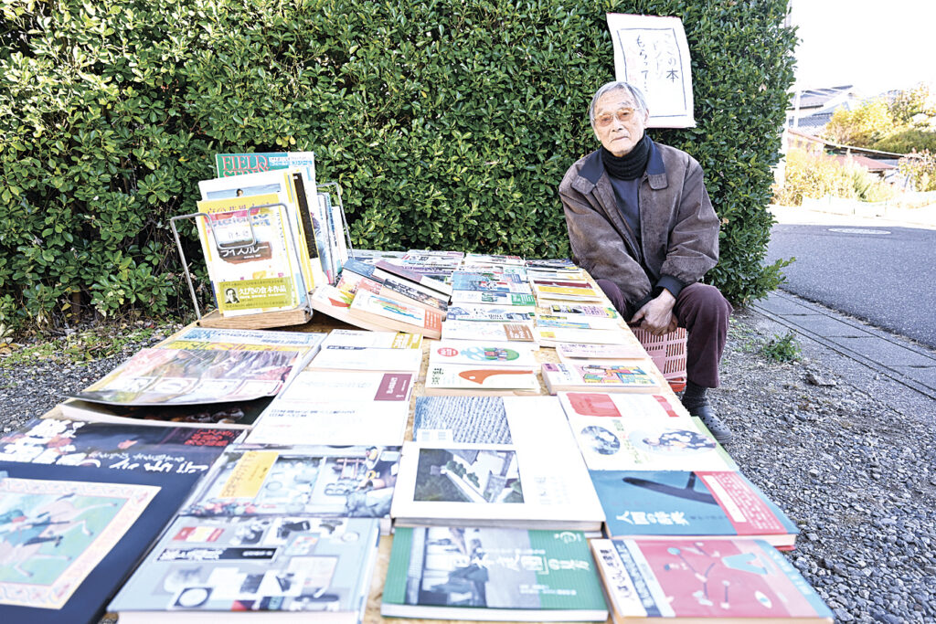 自宅は松本県ケ丘高校とエクセラン高校のほぼ中間にある。天気がいい朝、畳1枚ほどの板の上に70冊程度を並べ、垣根に「ここの本 ドンドンもらって」と看板を掲げている。日没前にしまう。11月に始め、これまでに散歩途中の人や高校生が山や映画関係の本をもらっていった。