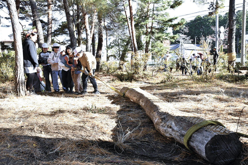 21日は、5年4組の児童33人が外で遊べる場所を増やそうと、一本橋と、切り株を並べて飛び石のように跳びはねて渡る遊具を設けた。片面を平らに加工された栗の木にロープをくくり付け、力いっぱい引っ張って移動させた。木が置かれる両端の地面はくわなどを使って掘り、木の表面はやすりがけをして仕上げた。遊具はさまざまな高さと形の切り株を移動させ、9個ほど並べた。柳澤懸君(11)は「みんな一生懸命にやすりで磨いていて、よかった」と話した。