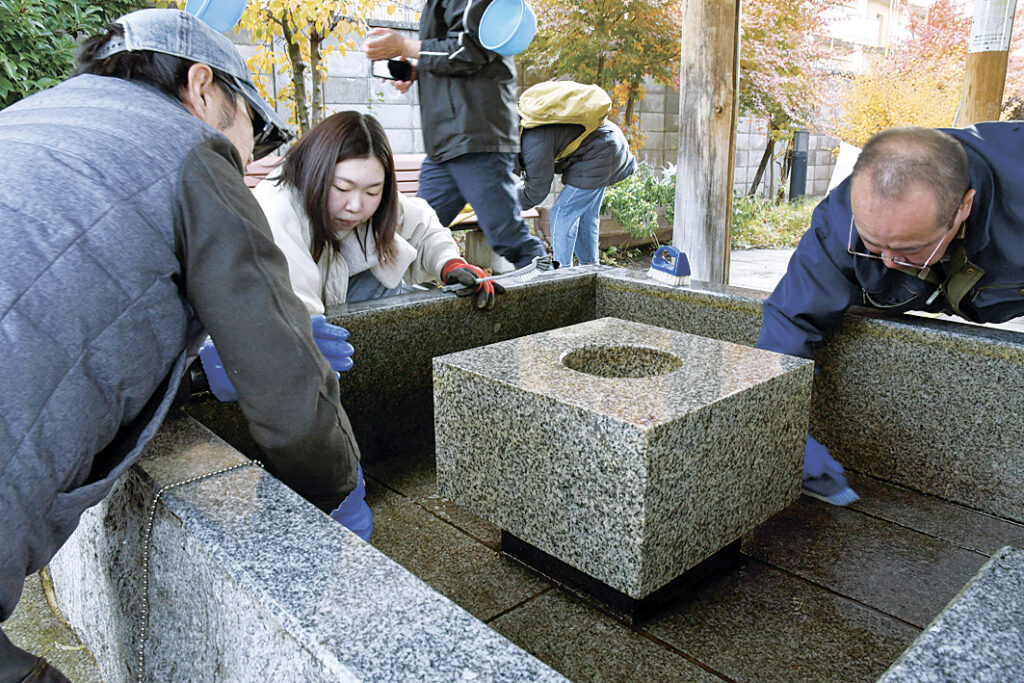 井戸と、湧き水が流れる小川、公園内を地域住民約20人が清掃した。湧き水を止めて排出し、井戸の底と壁面、溝にこびり付いたあかをブラシで落とした。小川の底をこすり、公園内の落ち葉を集めてきれいにした。参加した20代女性は「掃除するときれいになったと分かって達成感がある。3人でやるのは大変そう」と話していた。